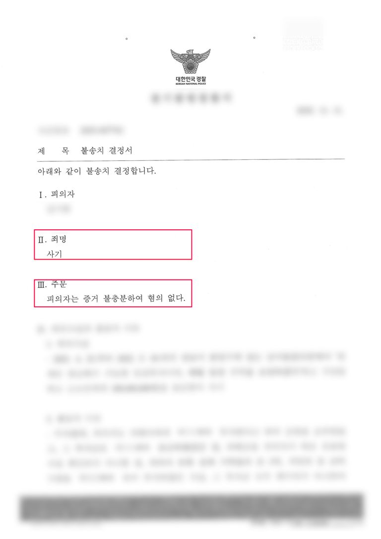 수사기관은 “피의자의 기망행위나 재산상 이익 취득 정황이 확인되지 않는다”며 증거 불충분으로 불송치 결정을 내렸습니다.