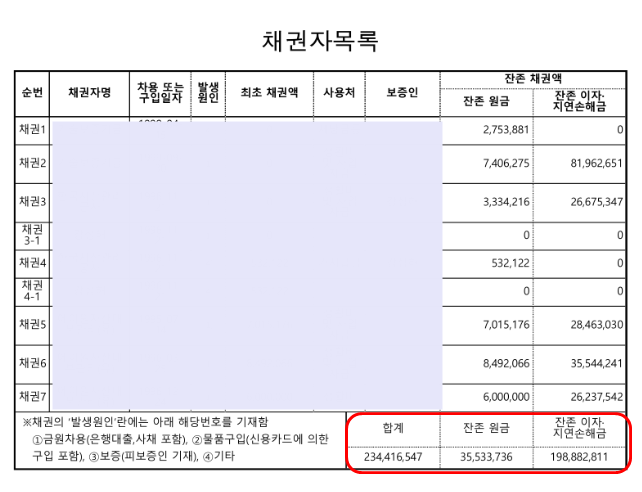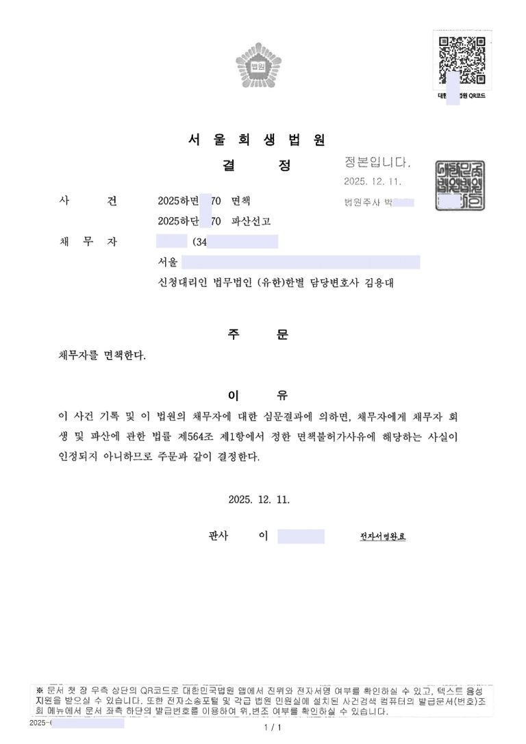 파기 환송 후 재판부에서 다시 별도 파산관재인 선임 없이 면책을 하려 했으나 일부 채권자의 채권 존부가 문제가 되어 부득이 파산선고 및 관재인 선임하여 일정 절차를 거친 후 최종적으로 채무 2억 3,500여만원에 대하여 면책(탕감)결정이 되었습니다.