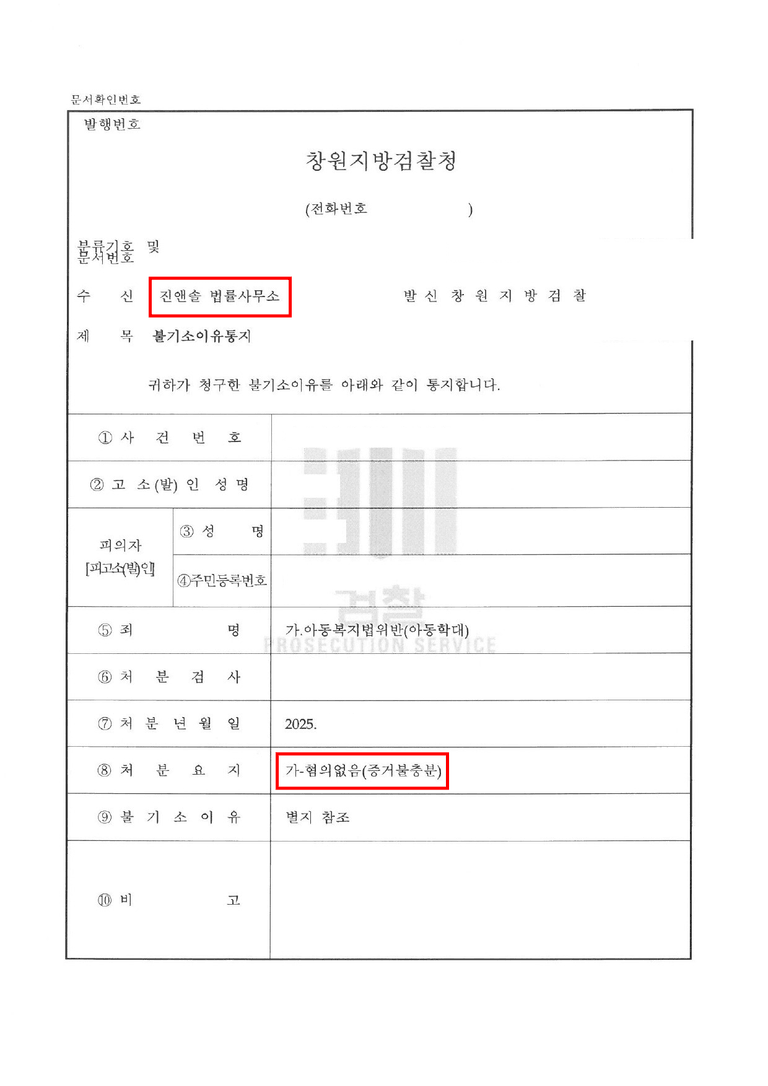 이와 같은 진앤솔 법률사무소의 전략으로, 수사기관은 정서적 학대의 고의성·지속성·구체적 위험을 소명하기에는 증거가 부족하다고 판단하였고, 최종적으로 불기소(증거불충분)라는 결과를 이끌어 냈습니다.