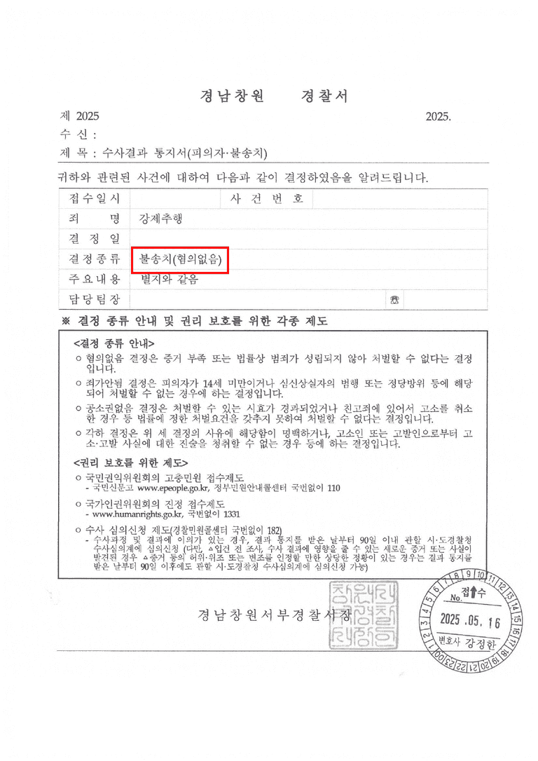 진앤솔 법률사무소는 의뢰인께 유사강간, 강제추행 혐의에 대해 혐의없음으로 불송치 처분이라는 결과를 안겨 드릴 수 있었습니다.
