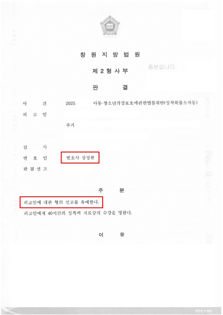 ![[선고유예] 아동·청소년 성착취물 사건 선고유예 사례](/_next/image?url=https%3A%2F%2Fd2ai3ajp99ywjy.cloudfront.net%2Fuploads%2Ftitleimage%2Foriginal%2F5c480901b834cb67981158b4-original.jpg&w=3840&q=75)