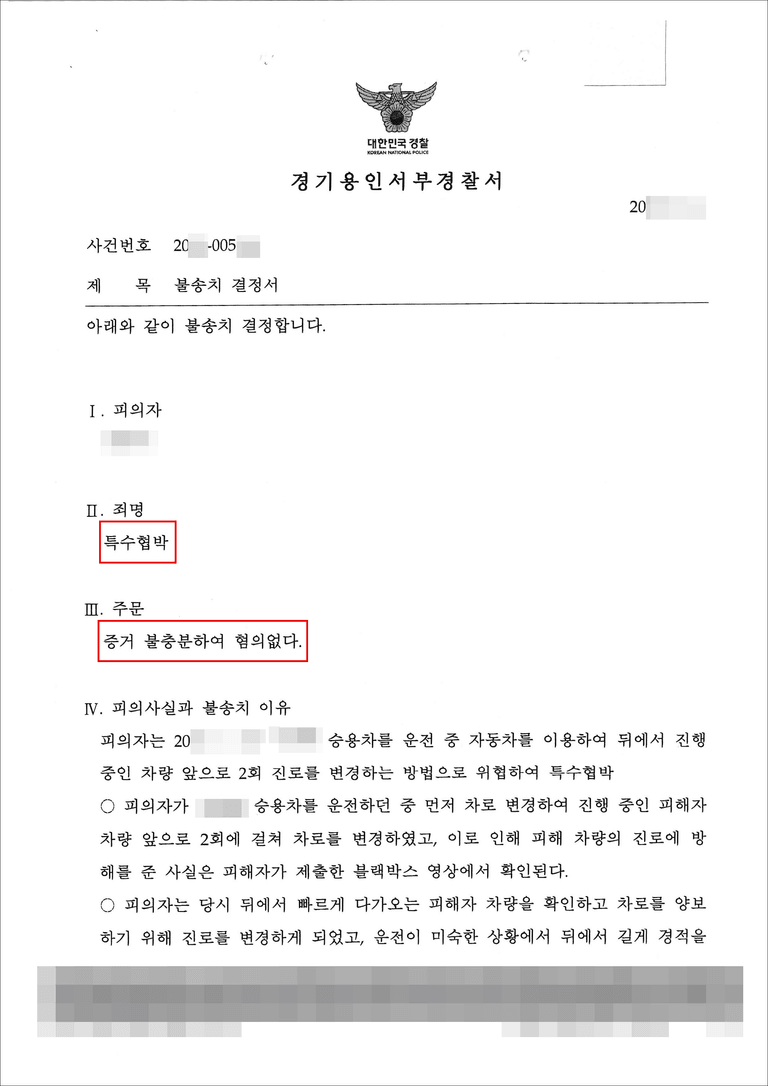 블랙박스 영상만을 보고 유무죄를 판단하는 것은 잘못된 결론을 도출할 수도 있겠다는 생각을 하게 만드는 동시에, 이 사건에서 고소인은 5분 가량의 블랙박스 영상을 증거로 제출했는데, 본인에게 유리한 자료라고 제출한 영상이 오히려 의뢰인의 무혐의를 입증해 줄 증거가 되었던 흥미로운 사건이었습니다. 도로 위 큰 사고를 방지하기 위해서 양보운전과 역지사지의 정신을 가져야 함을 다시 한번 깨닫게 되는 결과였습니다.