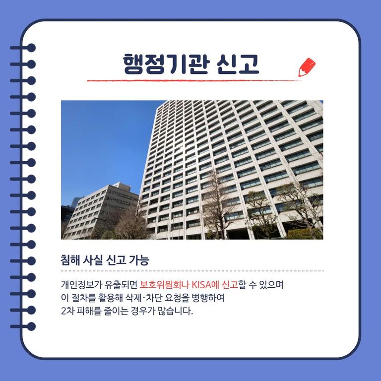 개인정보가 외부에 노출된 경우 개인정보 보호위원회나 한국인터넷진흥원에 침해 사실을 신고할 수 있습니다.