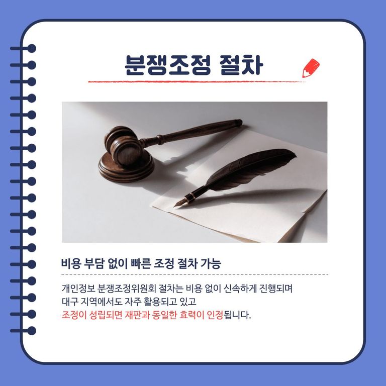 개인정보 분쟁조정위원회를 활용하면 비용 부담 없이 빠른 조정 절차가 가능합니다.