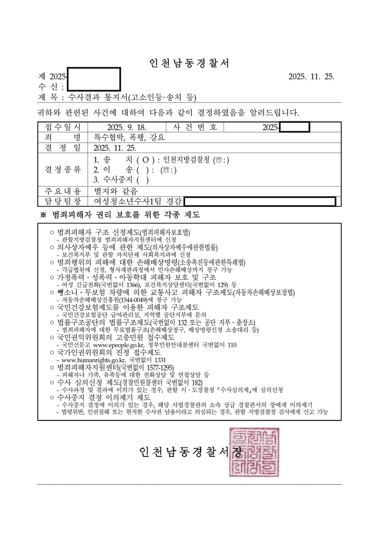 특수협박 피해를 입은 피해자를 대리하여 고소를 진행하였고, 인천남동경찰서에서 혐의 인정하여 검찰로 송치한 성공사례입니다.