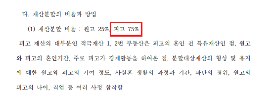 재산분할 비율도 무려 75%를 인정받았다는 데에 의의가 있는 사건입니다.