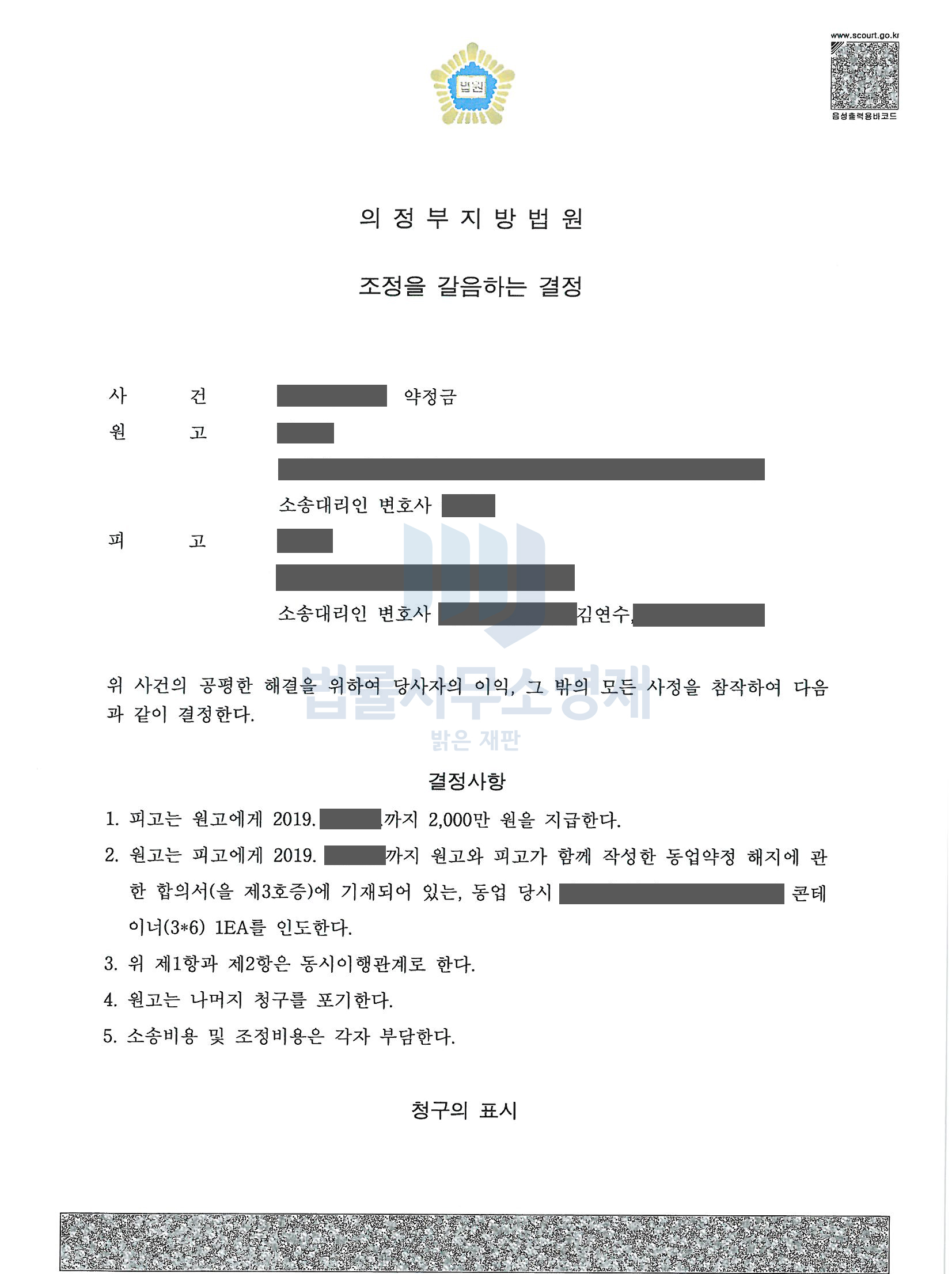 법원은 의뢰인에게 원고인 동업 상대방에 대하여 2,000만 원을 지급하라는 화해권고결정(강제조정)을 내렸습니다. 이로써 의뢰인은 상대방이 주장하는 금액의 상당부분을 감액시키면서도 소송의 장기화를 막아 경제적인 손해를 최소화 할 수 있었습니다.