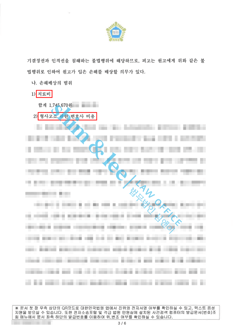 - 최종적으로 민사 재판부는 피고에게 손해배상 책임이 있음을 인정하고, 원고가 청구한 ① 실제로 지출한 적극적 손해인 치료비, ② 형사소송에서 사용한 변호사 선임 비용, ③ 피고의 불법행위로 인한 정신적 피해에 대한 위자료를 모두 받아들여 총 24,745,670원의 손해배상금을 인용했습니다.