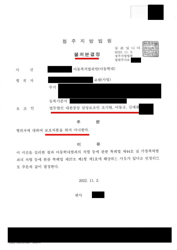 이 사건 의뢰인은 현직 중학교 교사로 아동학대 행위는 경미하지만 아동보호사건으로 진행되어 처분이 결정될 경우 이를 근거로 징계가 진행되므로 반드시 불처분 결정을 받기를 원하였습니다.