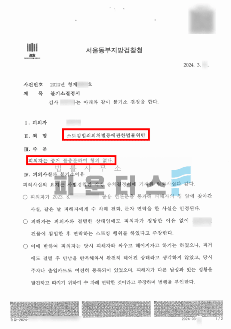 그 결과, 의뢰인은 검찰 단계에서 '혐의 없음' 불기소 처분을 받을 수 있었습니다. 저희 변호인은 스토킹 범죄의 성립 요건에 충족하지 않는다는 점을 집요하게 파고들어, 이를 입증해냄으로써 사건을 조기에 마무리지을 수 있었습니다.