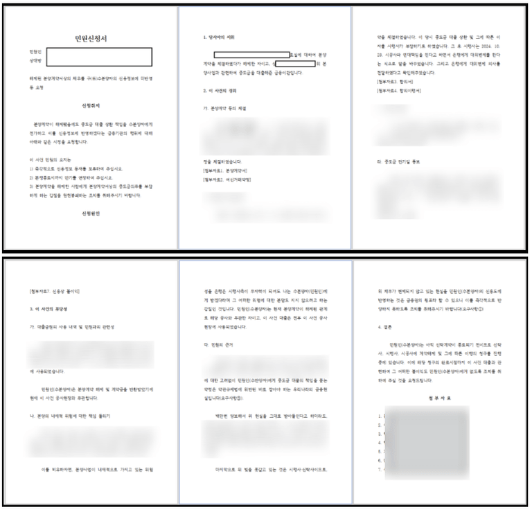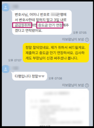 그 결과, 은행측에서 만기연장을 해줄터이니 민원을 취하하라는 연락을 받았습니다. 그리하여 중도금대출에 대한 부담 없이 분양사측과의 분쟁을 잘 마무리지을 수 있었습니다.