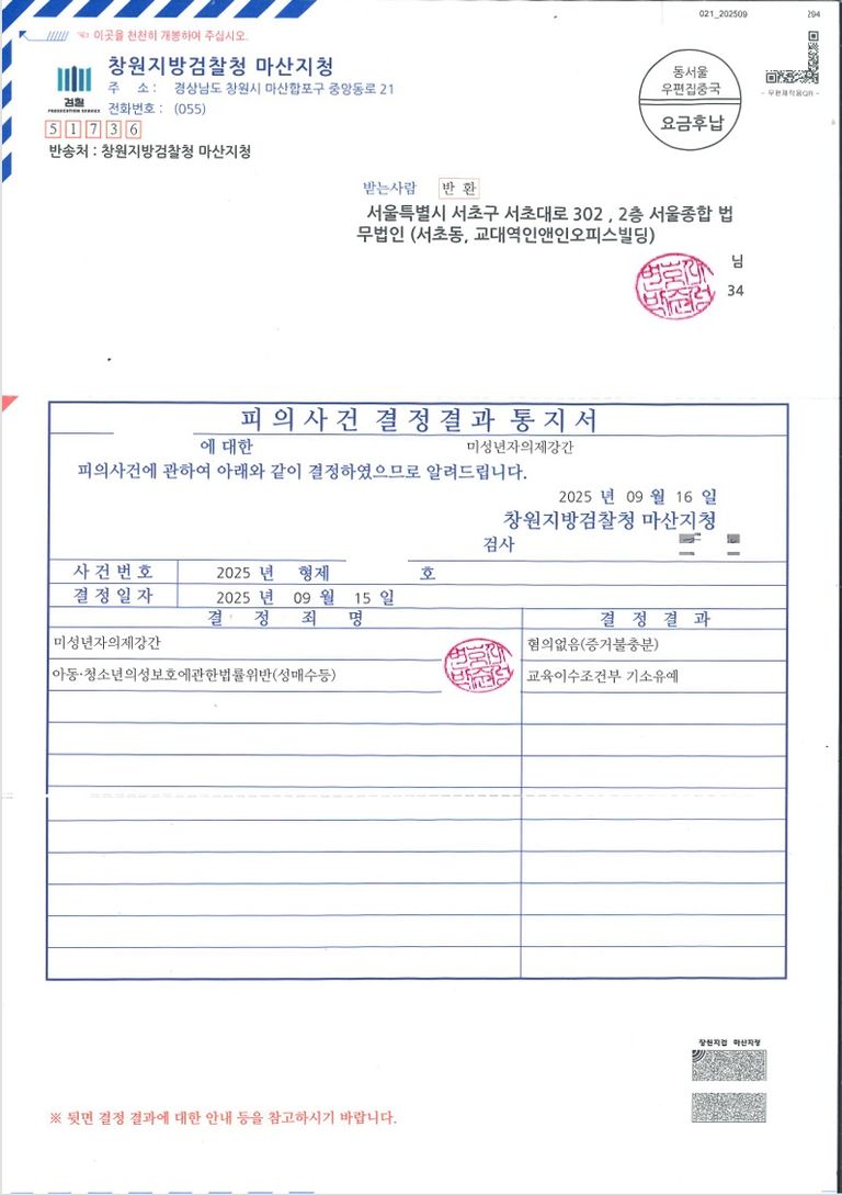 미성년자의제강간죄는 무혐의(증거불충분), 나머지 아청법위반(성매수) 사안에서 기소유예 처분을 받아 사건을 성공적으로 해결하였습니다.