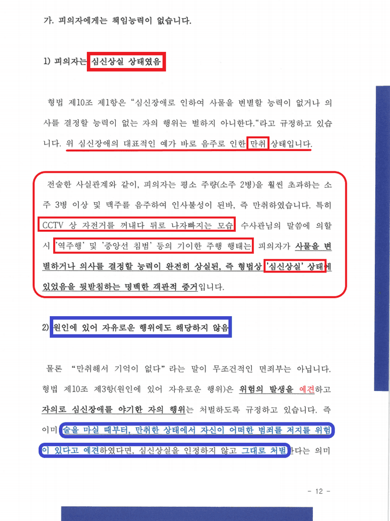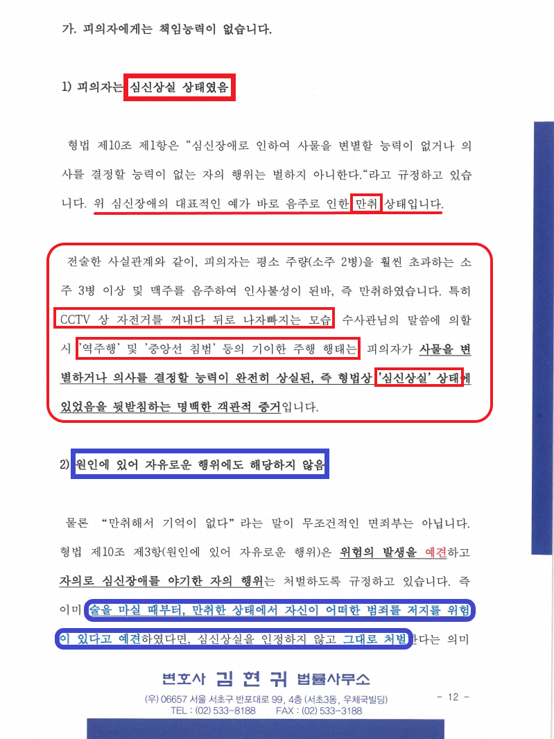 많은 분들이 법률적 조언을 받기 전 이런 말을 하십니다. "기억은 나지 않지만 결과적으로 미안하다" "정말 의도치 않았지만 혐반성한다" - 이런 말들은 매우 모순적입니다. 기억나지 않는다면, 의도치 않았다면 '행위'는 인정하되, 고의, 책임능력만은 부인해야 합니다.