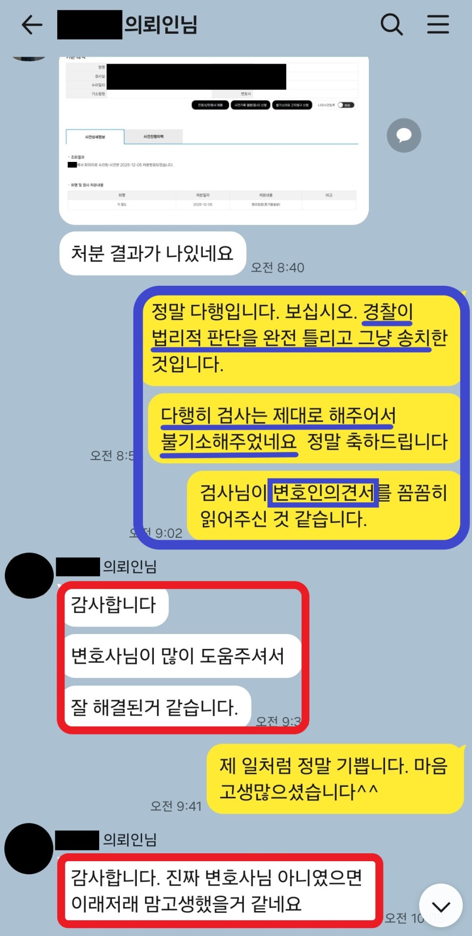 정말 다행히도, 검사는 제가 제출한 변호인의견서 내용을 그대로 원용하여 불기소 처분을 하였습니다. 이로서 담당 경찰의 송치 처분이 얼마나 잘못된 것인지, 법리적 판단을 그르친 것인지 알 수 있습니다.