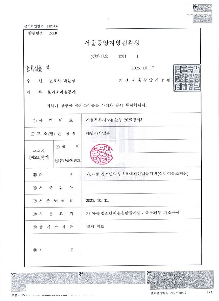서울경찰청 사이버수사대 수사관님이 사건을 수사해주셨는데, 소지죄와 시청죄 각 혐의 중에서 모든 피해자들에 대한 소지죄는 모두 불송치(혐의없음), 피해자 2명에 대한 시청죄도 불송치(혐의없음)으로 결정난 바 있습니다.
