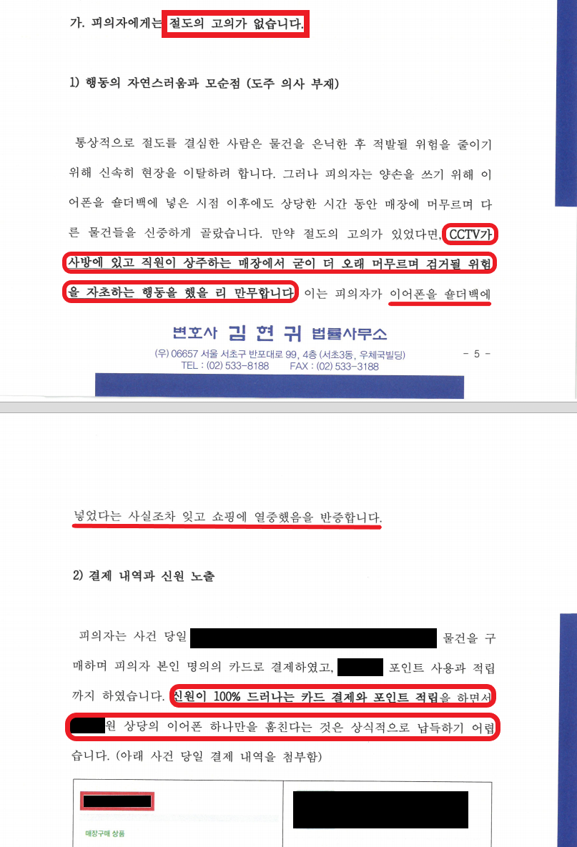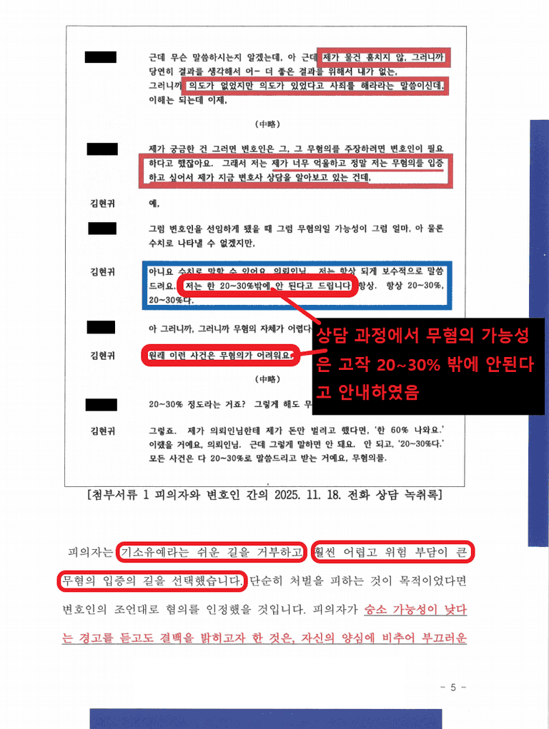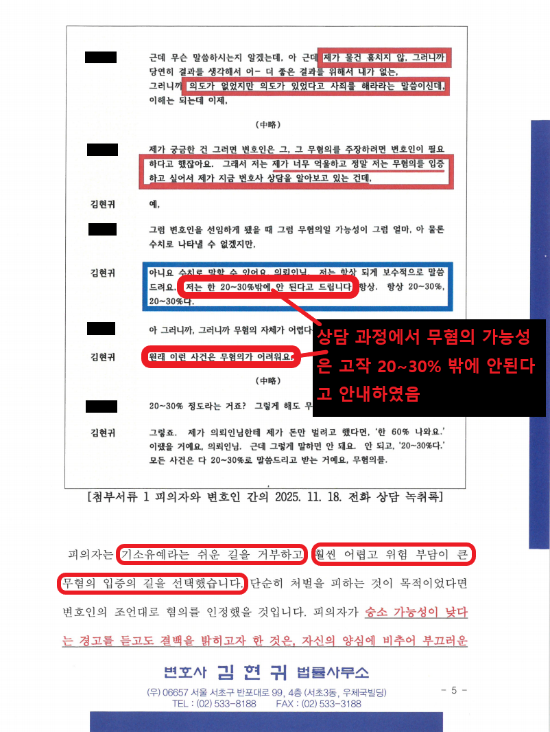 - 최초 상담 시 김현귀 변호사는 A에게 "초범이고, 피의 금액이 2만 5천원이라서 그냥 인정하고 합의하면 99% 기소유예가 나온다. 그런데 무혐의를 주장하면 20~30%의 확률로 불송치, 불기소가 나온다. 그래도 수백만 원을 주고 선임하시겠어요? 정말 억울한 경우에만 후자를 선택하세요"라고 안내함