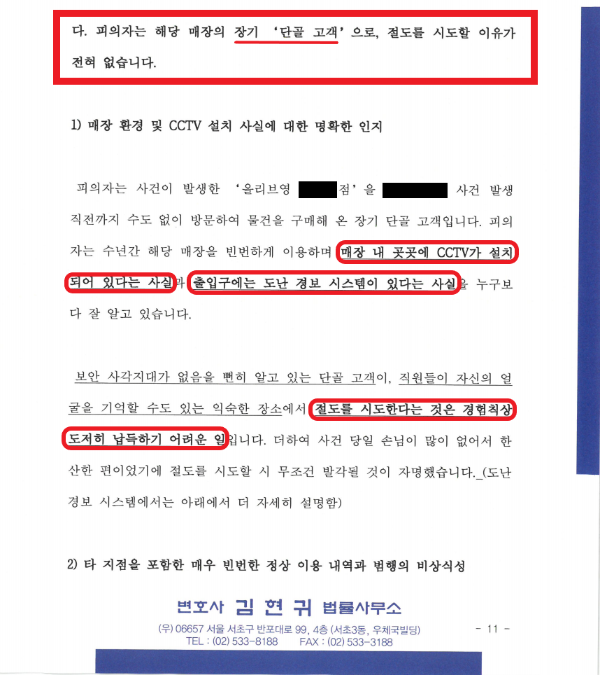 1) 수년간 해당 매장을 빈번하게 이용하며 매장 내 곳곳에 CCTV가 설치되어 있다는 사실과 출입구에는 도난 경보 시스템이 있다는 사실을 누구보다 잘 알고 있음