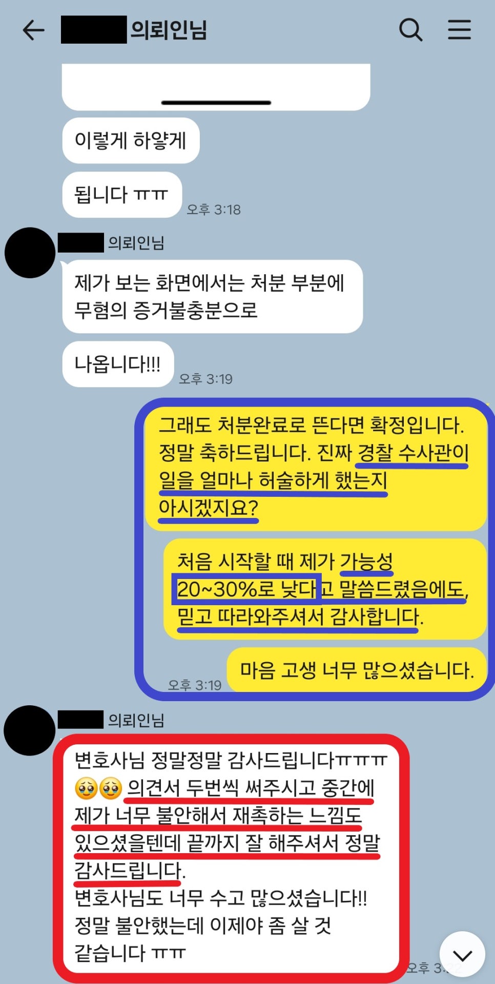 정 말 다행히도, 검사는 제가 제출한 1차, 2차 변호인의견서 내용을 믿어주어서 불기소 처분 하였습니다.