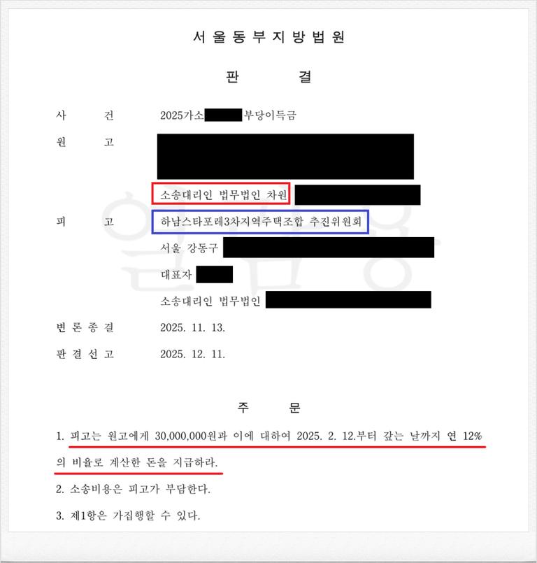 지역주택조합 관련 납입금 반환 소송을 의뢰해 주신다면, 별도의 추가 비용 없이 강제집행 절차까지 함께하며, 실제 환불이 이루어질 때까지 성공보수를 청구하지 않는 원칙을 고수하고 있습니다.