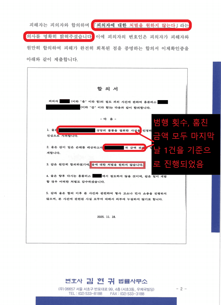 본 사건은 무려 10번의 절도, 총 120만 원 피해 금액에도 불구하고 1) 매우 전략적인 합의와 2) 변호인의견서 제출로 기소예를 이끌어낼 수 있었습니다. 대형 마트 어디든 절도 피의자가 된 상황이라면 연락주십시오. 가족들 모르게, 전과 남지 않도록 도움드리겠습니다!
