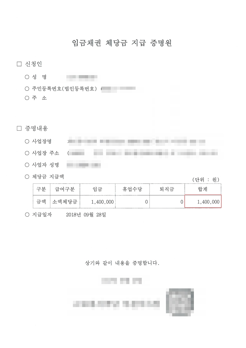 결과는 청구금액 100% 승소 하였고, 근로복지공단에 임금채권 체당금 신청을 하여 퇴직일 기준 최근3개월에 대한