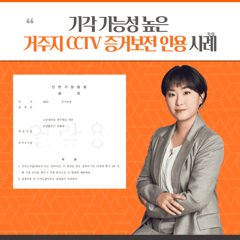 일반적으로 CCTV 증거보전을 많이 신청하는 모텔과 달리 거주지, 상가 등은 사생활의 보호성이 더 크므로 기각 결정이 나오는 경우가 많습니다. 따라서 인용 받을 수 있도록 최선을 다했습니다.