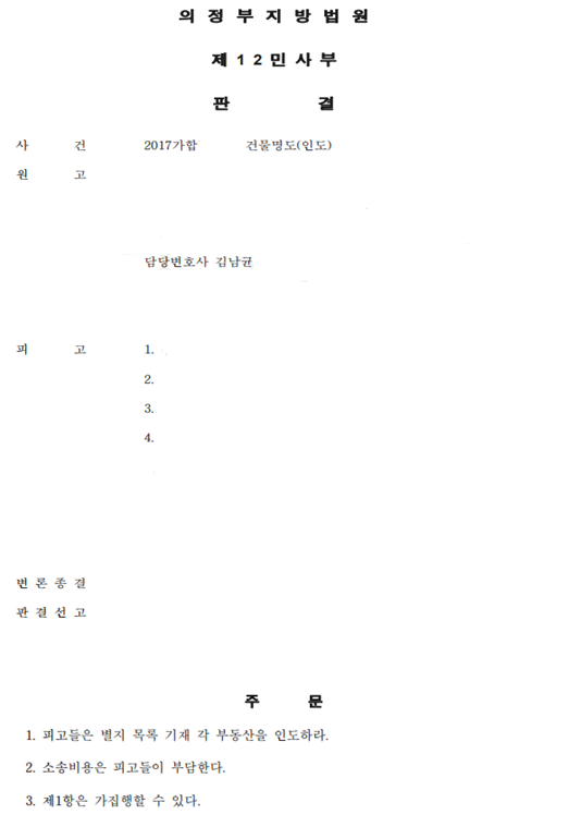 특히 일부 피고의 경우 채권자 지위 자체가 인정되기 어렵고, 다른 피고들 역시 점유가 경매개시 이후에 형성되었거나 채무자 및 제3자의 간섭을 배제한 점유로 보기 어렵다는 점을 다수의 증거와 선행 확정판결을 토대로 주장하였고, 이어 본 법인은 피고들의 유치권 항변은 모두 이유 없으며, 원고의 건물명도 청구는 정당하다는 점 역시 주장하였습니다.