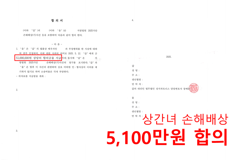 📌오늘은 배우자의 외도 사실을 알게된 의뢰인의 손해배상 청구와 5,100만원의 합의 성공사례를 공유하고자 합니다.