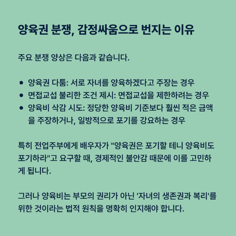 특히 전업주부에게 배우자가 "양육권은 포기할 테니 양육비도 포기하라"고 요구할 때, 경제적인 불안감 때문에 이를 수락할지 고민하게 됩니다. 그러나 양육비는 부모의 권리가 아닌 '자녀의 생존권과 복리'를 위한 것이라는 법적 원칙을 명확히 인지해야 합니다.
