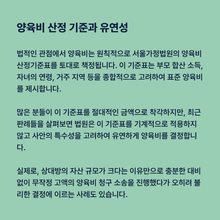 실제로, 상대방의 자산 규모가 크다는 이유만으로 충분한 대비 없이 무작정 고액의 양육비 청구 소송을 진행했다가 오히려 불리한 결정에 이르는 사례도 있습니다.