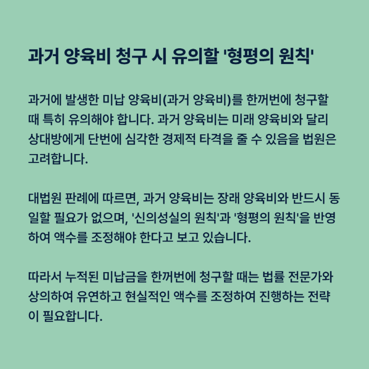 과거에 발생한 미납 양육비(과거 양육비)를 한꺼번에 청구할 때 특히 유의해야 합니다. 과거 양육비는 미래 양육비와 달리 상대방에게 단번에 심각한 경제적 타격을 줄 수 있음을 법원은 고려합니다.