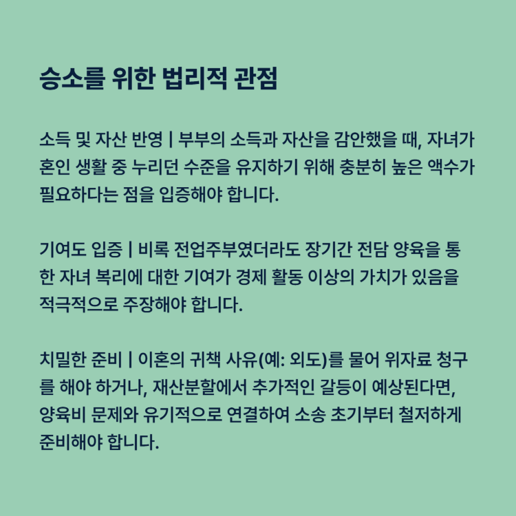치밀한 준비: 이혼의 귀책 사유(예: 외도)를 물어 위자료 청구를 해야 하거나, 재산분할에서 추가적인 갈등이 예상된다면, 양육비 문제와 유기적으로 연결하여 소송 초기부터 철저하게 준비해야 합니다.