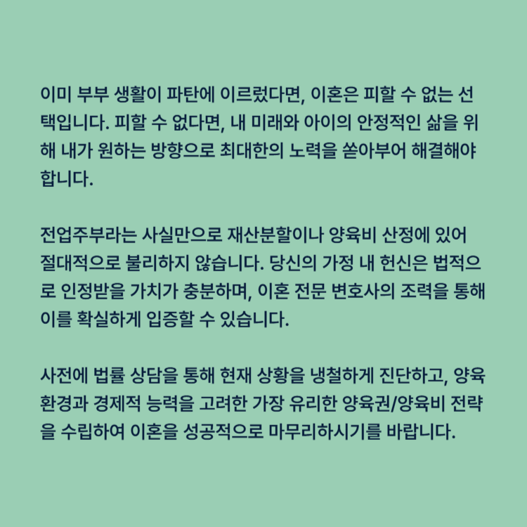 전업주부라는 사실만으로 재산분할이나 양육비 산정에 있어 절대적으로 불리하지 않습니다. 당신의 가정 내 헌신은 법적으로 인정받을 가치가 충분하며, 이혼 전문 변호사의 조력을 통해 이를 확실하게 입증할 수 있습니다.