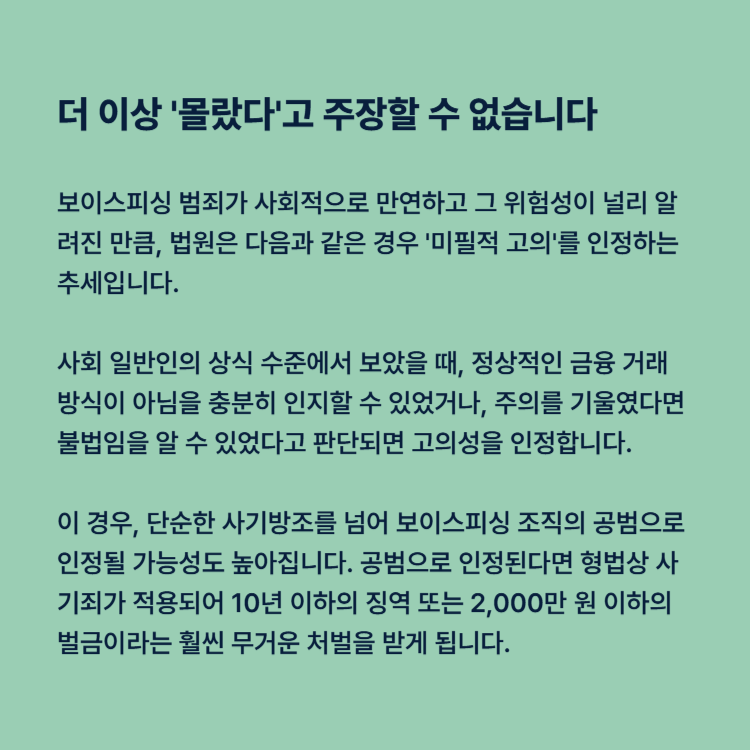 하지만 현재는 상황이 완전히 달라졌습니다. 보이스피싱 범죄가 사회적으로 만연하고 그 위험성이 널리 알려진 만큼, 법원은 다음과 같은 경우 '미필적 고의'를 인정하는 추세입니다.