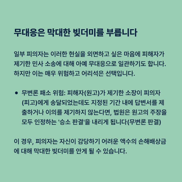 일부 피의자는 이러한 현실을 외면하고 싶은 마음에 피해자가 제기한 민사 소송에 대해 아예 무대응으로 일관하기도 합니다. 하지만 이는 매우 위험하고 어리석은 선택입니다.