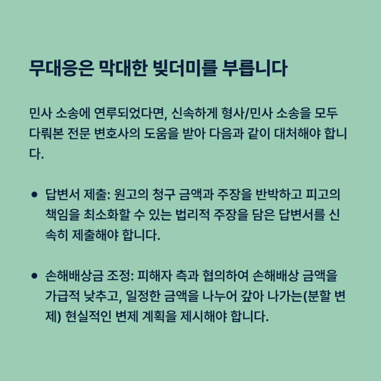 따라서 민사 소송에 연루되었다면, 신속하게 형사/민사 소송을 모두 다뤄본 전문 변호사의 도움을 받아 다음과 같이 대처해야 합니다.