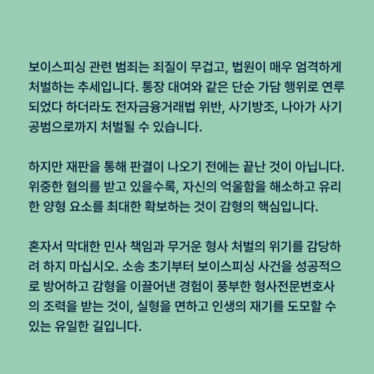 보이스피싱 관련 범죄는 죄질이 무겁고, 법원이 매우 엄격하게 처벌하는 추세입니다. 통장 대여와 같은 단순 가담 행위로 연루되었다 하더라도 전자금융거래법 위반, 사기방조, 나아가 사기 공범으로까지 처벌될 수 있습니다.