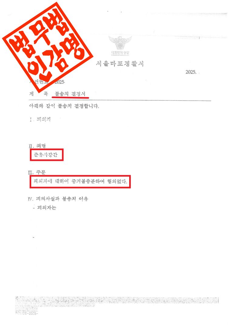 서울마포경찰서는 이 사건에 대해 다음과 같은 사유로 불송치 결정을 하였습니다.