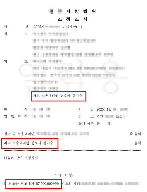 원고 측은 우리가 보낸 합의안 내용에 대해 별다른 대응을 하지 않았지만 막상 조정기일에는 대부분 응하여 속전속결로 조정이 성립되었습니다.