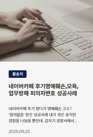 ![[명예훼손] 사이버 명예훼손 고소당했다면: 성립요건, 핵심 전략](/_next/image?url=https%3A%2F%2Fd2ai3ajp99ywjy.cloudfront.net%2Fuploads%2Ftitleimage%2Foriginal%2F5d90747af25695bfd9f06f35-original.jpg&w=3840&q=75)