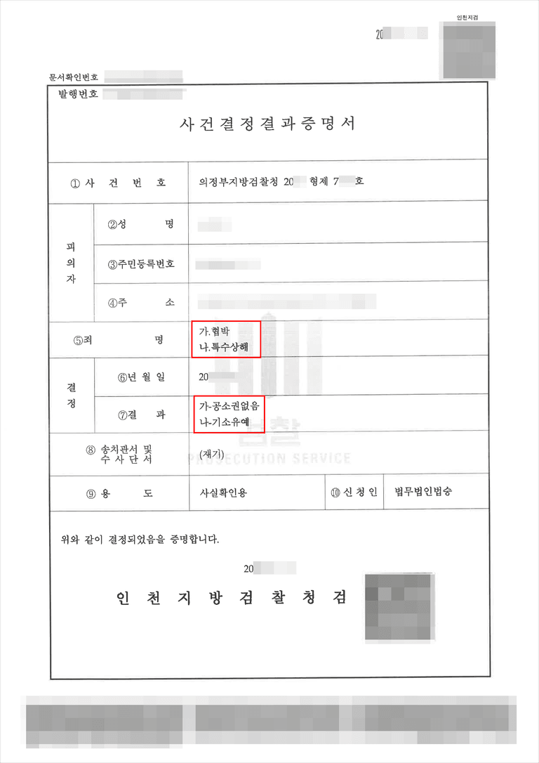 피의자는 상대방과 형사조정하였는바, 협박에 대하여는 반의사불벌죄이므로 ‘공소권 없음’, 특수폭행에 대하여는 ‘기소유예’ 결정을 받았습니다.