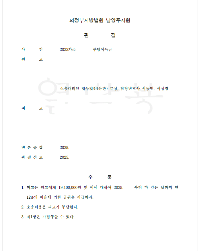 저는 즉각 입금 받은 자를 피고로 하여 민사소송 부당이득반환청구소송을 제기하였고 법원은 원고 승소 판결을 선고하여 의뢰인은 피해액을 반환받았습니다.