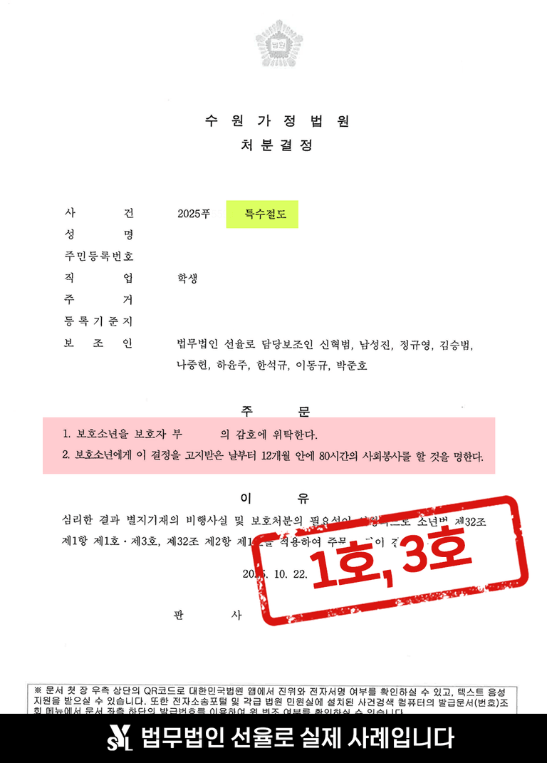 소년재판에서 1, 3호의 낮은 보호처분이 결정되었습니다.