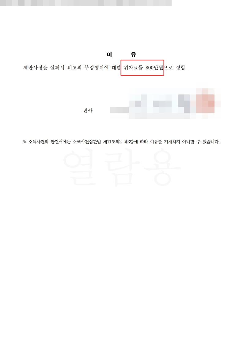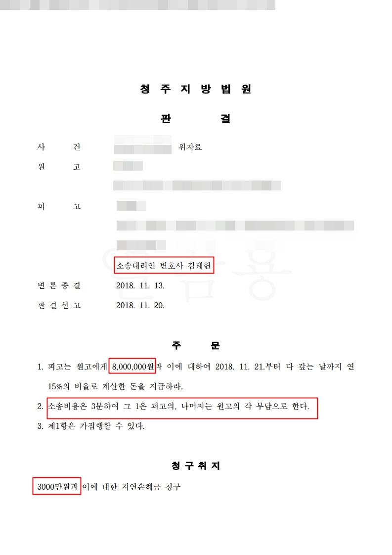 이 사건의 원고는 피고에게 본인의 배우자와 부정행위를 원인으로 피고에게 위자료3,000만원을 청구하였습니다. 저는 피고의 소송대리인으로써 최선을 다해 방어하여 위자료 800만원을 선고 받았습니다. 위자료 3000만원 중 800만원이 인정된것 이므로 원고의 청구금액 중 약26%만 인정된 사건입니다. 선고 내용 중 소송비용의 2/3를 원고측이 부담하므로 피고는 원고로부터 약 200만원의 소송비용을 지급 받을수 있고, 결국 피고는 원고에게 약 600만원만 지급하면 되는 사건 이였습니다.