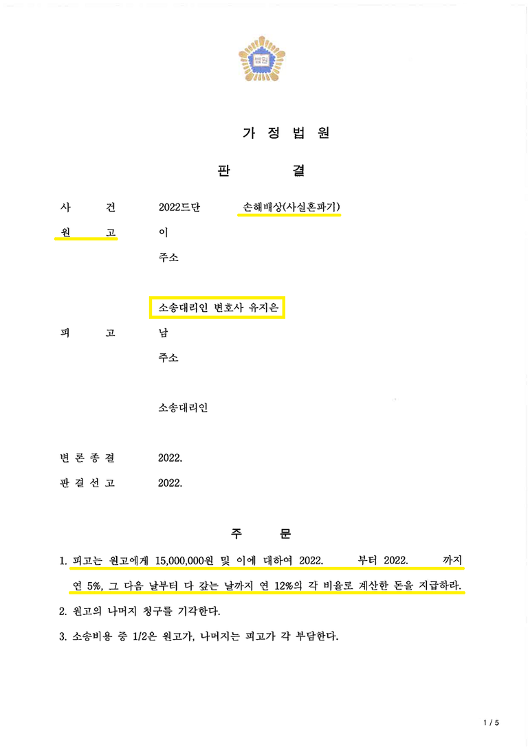 혼인기간이 워낙 짧아서 소송으로 갔을 경우 남편과 상간녀 합해서 위자료는 통상 2천 정도 나왔을텐데 다행히 의뢰인이 원하는 대로 남편과는 합의가 성립되었고, 추가로 상간녀로부터 위자료 1,500만 원을 받으며 성공적으로 마무리한 사안입니다.
