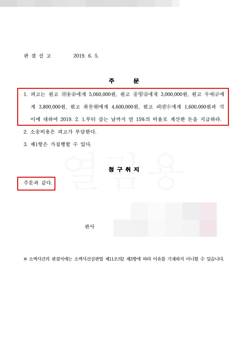이에 승소판결을 받고 소액체당금을 받을 수 있었습니다.
