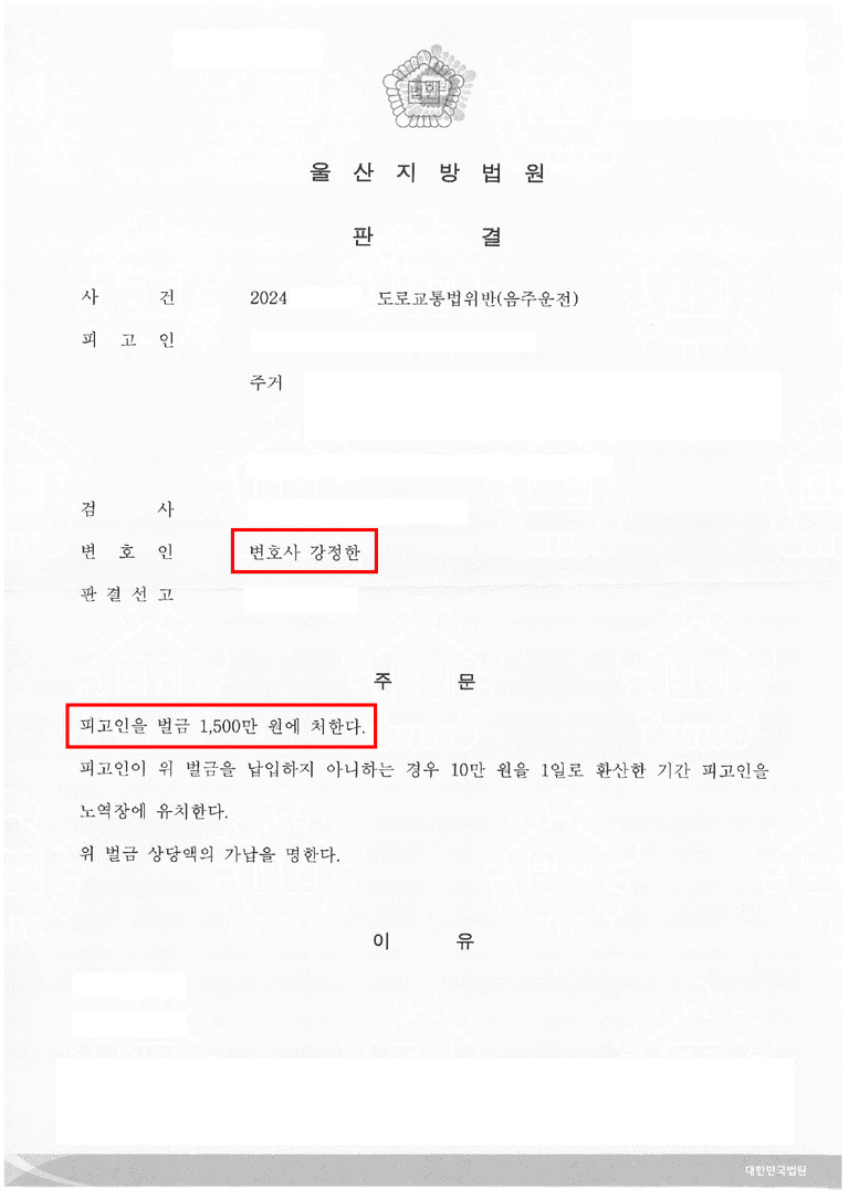 혈중알코올농도 0.154%라는 높은 수치와 재범이라는 무거운 비난 가능성에도 불구하고, 진앤솔 법률사무소의 조력을 통해 벌금 1,500만 원 선고에 그칠 수 있었습니다.