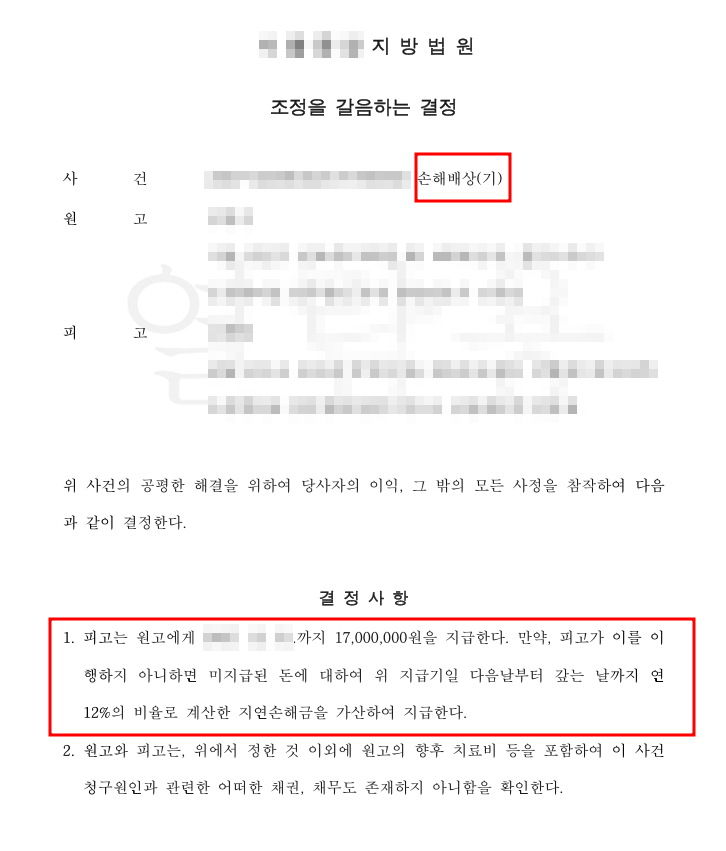 그 결과 민사 조정절차를 거쳐 1,700만 원이라는 치료비와 위자료를 받을 수 있었고 의뢰인께서는 연신 저에게 감사 인사를 전해주셨습니다.