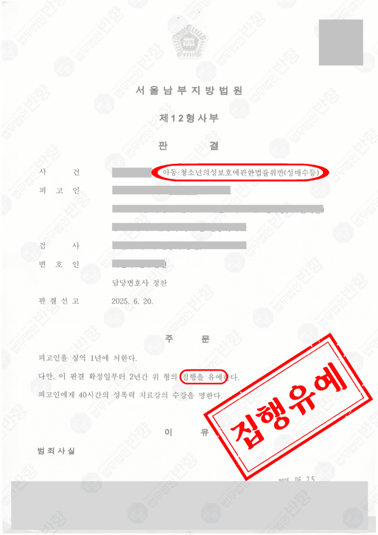 성매수 사건은 단순 적발로 끝나지 않고 재판까지 이어질 경우 실형 위험도 배제할 수 없습니다. 의뢰인처럼 사건 초기부터 전문가의 조력을 받아 사실관계를 정리하고 반성 및 재발 방지 노력을 충실히 준비하면 집행유예와 같은 선처를 기대할 수 있습니다. 혼자 대응하기엔 부담이 큰 사안이므로 비슷한 상황에 놓였다면 지체하지 말고 법무법인 반향에 상담을 요청하시기 바랍니다. 정찬 변호사가 직접 사건을 검토해 가장 안전한 해결책을 안내해드리겠습니다.