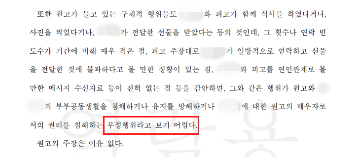 재판부는 두 사람이 어플로 만나 데이트 하게 된 점은 인정하면서도, 두 사람의 연락이 대부분 원고의 남편의 주도로 이루어진 점, 의뢰인이 원고의 남편의 연락과 방문을 성폭력 상담시설에 신고하는 등 해당 기간 중 두 사람이 교제하였다는 증거로 보이지 않는다는 이유로 원고의 청구를 전부 기각하였습니다.